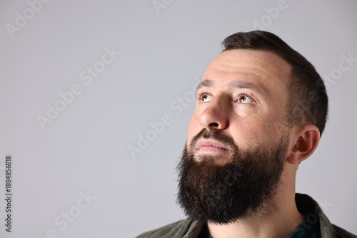 © New Africa, Obraz premium Man with mustache and beard on light grey background. Space for text