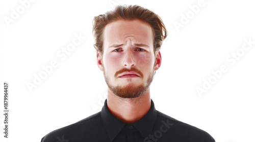 Fototapeta premium Man with neutral expression on white background, emotional detachment visible