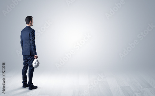 © ra2 studio, Obraz premium Man with object in his hand in an empty space