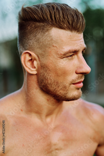 © VICHIZH, Obraz premium man with pumped up muscular body outdoors health workout