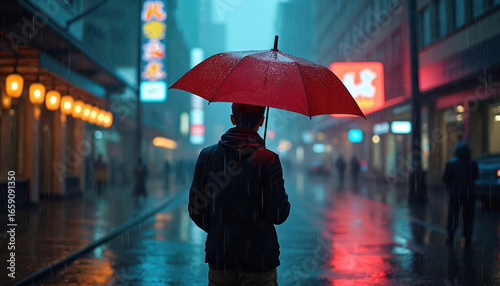 © Vadym, Obraz premium Man with red umbrella walks through rainy city street. Blurred neon lights reflect on wet pavement. Moody, atmospheric scene captures urban nightlife, solitude, protection from weather. Focus on