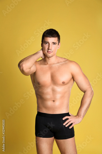 Fototapeta premium Man with sexy body on yellow background