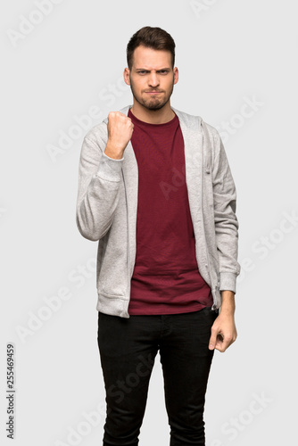 © luismolinero, Fototapeta premium Man with sweatshirt with angry gesture over grey background