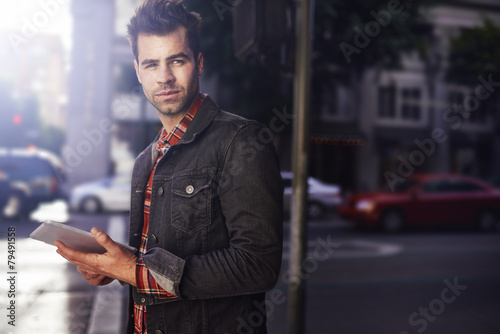 © Joshua Resnick, Obraz premium man with tablet in down town los angeles