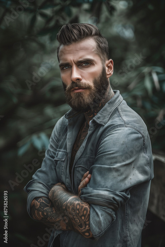 © Steven, Fototapeta premium Man with tattoos and a beard in a denim shirt, standing with arms crossed, creating a strong and rugged look