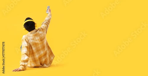Fototapeta premium Man with TV remote controller and headphones sitting on yellow background with space for text, back view
