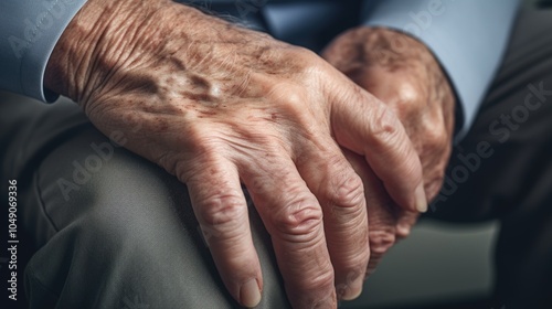 Fototapeta premium Man with wrinkled hands is sitting on a chair. Concept of aging and vulnerability