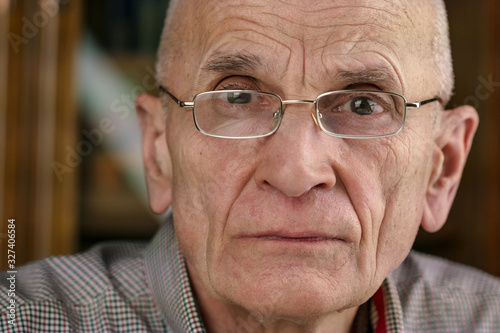 © Bonsales, Obraz premium man with wrinkles on face on blurred background at home