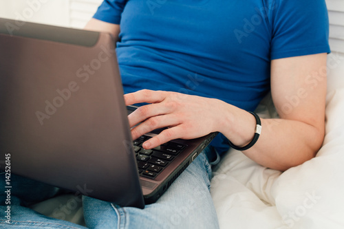 © irina_timokhina, Naklejka premium Man working at a laptop sitting on the bed