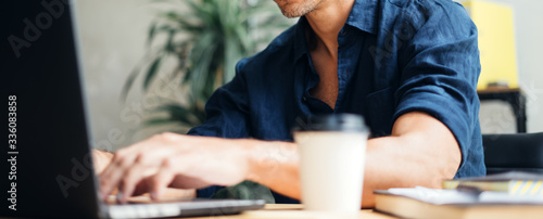 Fototapeta premium Man working on laptop at bright studio
