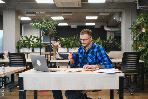 Obraz premium Man working on laptop in modern coworking office