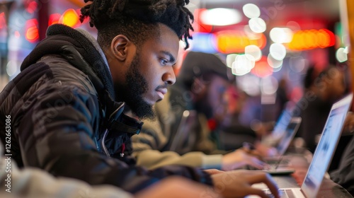 © Rafliii, Obraz premium Man Working Remotely on Laptop in a Cozy Café