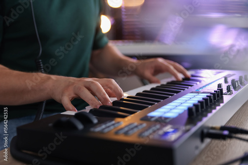 Fototapeta premium Man working with MIDI keyboard at table indoors, closeup