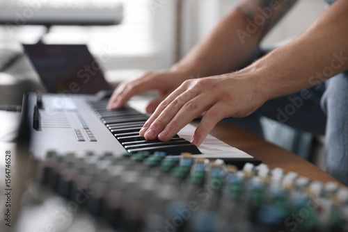 Fototapeta premium Man working with MIDI keyboard at table indoors, closeup