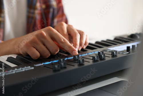 Fototapeta premium Man working with MIDI keyboard at table indoors, closeup