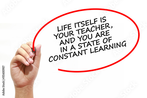 Fototapeta premium Man writing LIFE ITSELF IS YOUR TEACHER, AND YOU ARE IN A STATE OF CONSTANT...