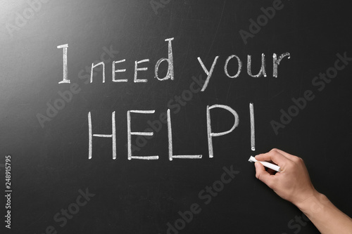 © New Africa, Fototapeta premium Man writing phrase "I need your help" on chalkboard, closeup