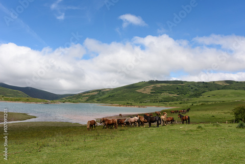© peredapatri, Obraz premium Manada de caballos paciendo junto a un embalse en zona montañosa.