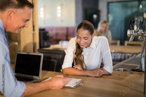 Fototapeta premium Manager and bartender discussing over clipboard in bar