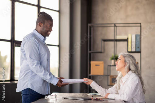 © Prostock-studio, Obraz premium Manager Lady Giving Papers Making Career Offer To Applicant Indoor