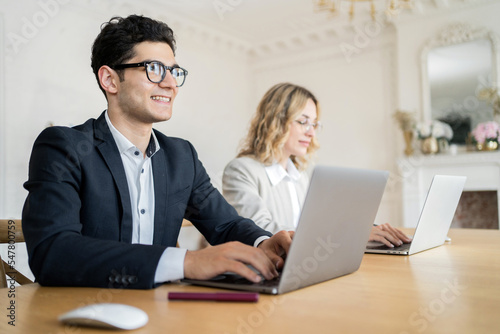 Fototapeta premium Managers are people brainstorming in the office on a new startup and project. The glasses use a laptop computer.