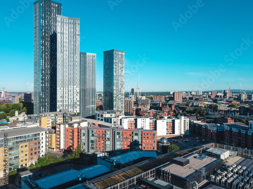 © Sam Foster, Naklejka premium Manchester City Centre Drone Aerial View Above Building Work Sky