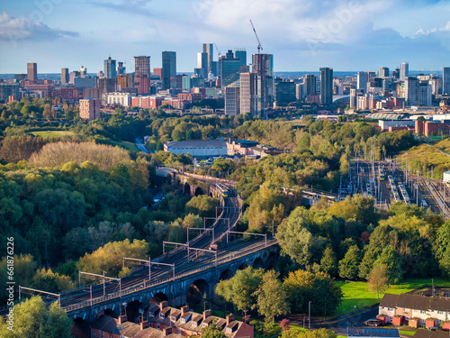© bardhok, Naklejka premium Manchester skyline taken from a park nearby showing the colours of Autumn.