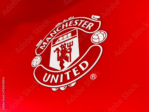 © AS Photo Family, Obraz premium Manchester United crest logo on red background, iconic football club emblem for Manchester, UK