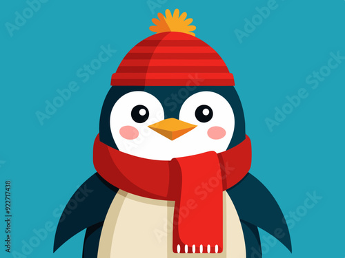 © VectorVibe, Naklejka premium Manchot empereur avec bonnet en tricot rouge et écharpe d'hiver