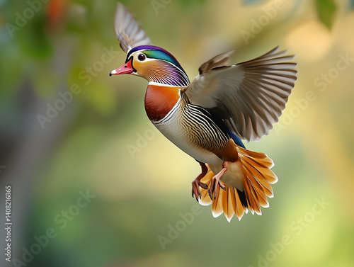 © Md. Din islam, Obraz premium Mandarin duck in graceful flight, Colorful duck flying midair