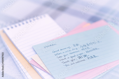 Obraz premium Mandarin; Learning New Language Writing Greetings on the Noteboo