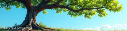 © vilavanh, Naklejka premium Mandarin tree trunk and roots against a clear blue sky, Leafy, Botanical
