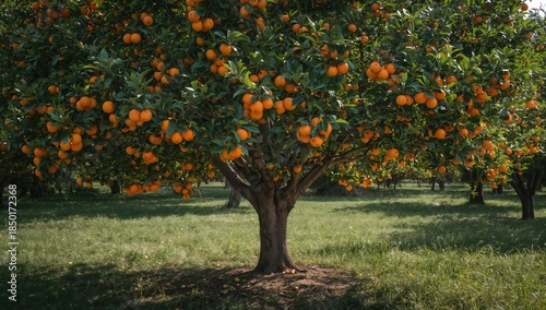 © AkuAku, Fototapeta premium Mandarins growing on a tree in natural sunlight, illustrating agricultural practices and fruit ripening