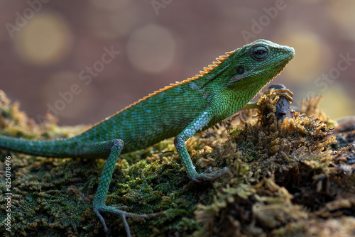 © DS light photography, Fototapeta premium Maned forest lizard sunbathing on a tree log
