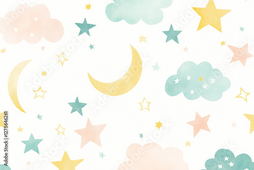Obraz premium パターン, 子供向け, 子供, 水彩, 星, 空, 雲, ベクター, イラスト, 夜, 月, manga, 乗り切る, デザイン, 模様, 自然, 虹,...