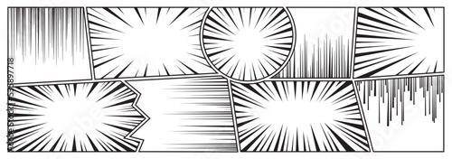 © Sylfida, Obraz premium Manga effect vector background, comic speed line set, anime action ray, motion frames, radial zoom abstract pattern, black strip explosion. Cartoon illustration