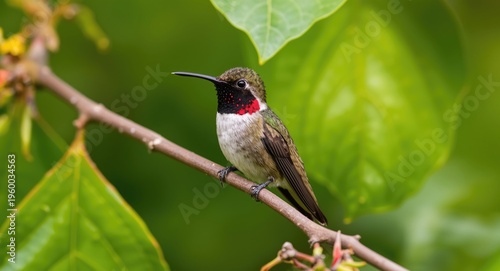 © CreativeBro, Fototapeta premium Mango hummingbird perched with a contrasting green leaf background
