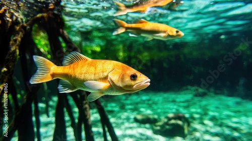 Naklejka premium mangrove forest restoration concept, Diverse Aquatic Life in the Shade of Mangrove Roots Underwater