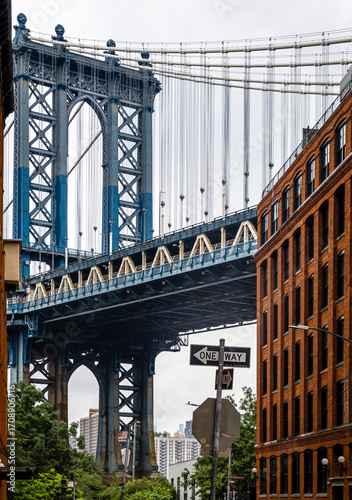 © Alexey Fedorenko, Naklejka premium Manhattan Bridge view framed by red brick buildings in DUMBO Brooklyn