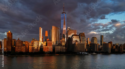 © Volodymyr, Fototapeta premium Manhattan skyline, New York, United States. Aerial Panorama of New York city skyscrapers in Manhattan. USA NYC. NY city. Lower NYC skyline. New York cityscape. America, New York City. NYC landmark.