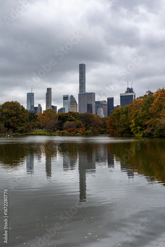 © Christopher, Fototapeta premium Manhattan skyscrapers reflected in Central Park lake