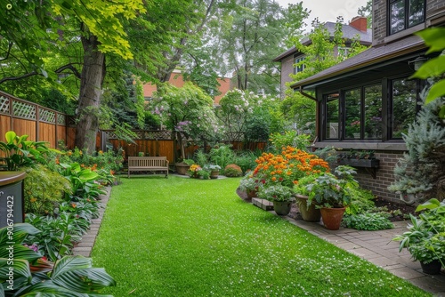 Naklejka premium Manicured backyard garden with green grass, flowers, and trees, Montreal home with wooden fence and seating area, small bench with potted plants and flower beds, lush foliage, vibrant colors