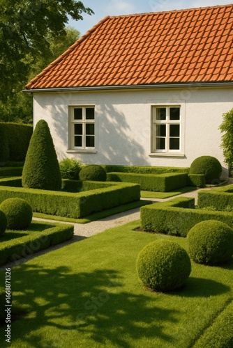 © Ulyana, Obraz premium Manicured garden with hedge sculptures and white house in sunny setting