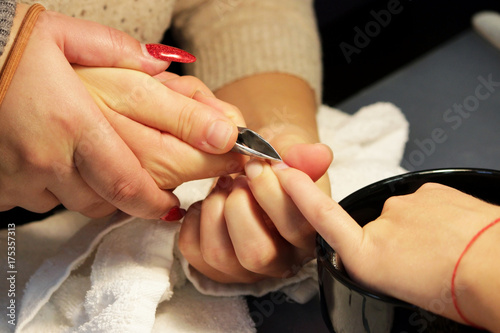 © wolfness72, Obraz premium manicurist at training courses shows students how to handle nails with the help of nippers cuticles before applying shellac.