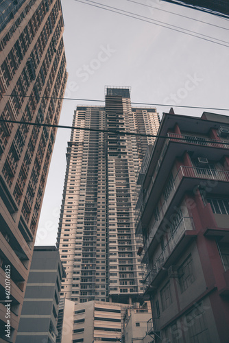 Naklejka premium Manila, Philippines, 28 march 2023. Walking in Binondo, Manila's Chinatown, looking up at it's tall, multi floor buildings and skyscrapers. Sunrise shots.