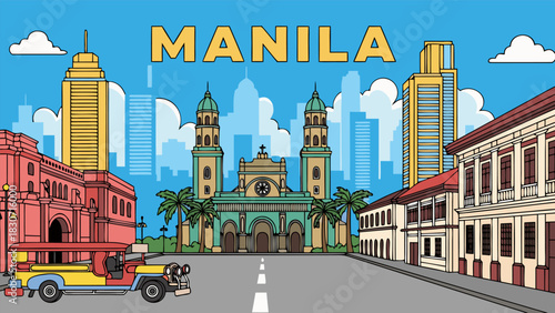 Obraz premium Manila Skyline Illustration Featuring Iconic Landmarks and Jeepney