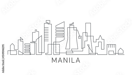 Fototapeta premium Manila stroke, single art skyline. Continuous urban panorama silhouette outline, vector illustration of Philippines city with buildings, skyscrapers. Thin line icon, logo, card