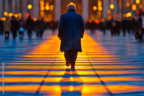 © Jibber , Obraz premium Mann im Mantel läuft durch Stadt bei Sonnenuntergang