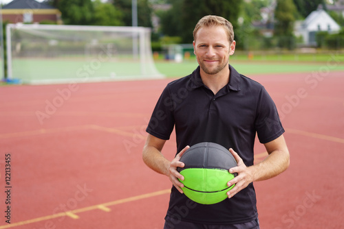 Fototapeta premium mann spielt draußen basketball auf einem sportplatz