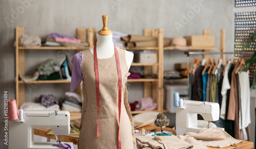© JackF, Obraz premium Mannequin with pinned unfinished linen dress and measuring tape in sewing studio, surrounded by fabric shelves, garment rack, and sewing tools, capturing creative tailoring atmosphere..